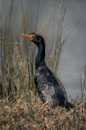 Reed cormorant in grass on sunny riverbank