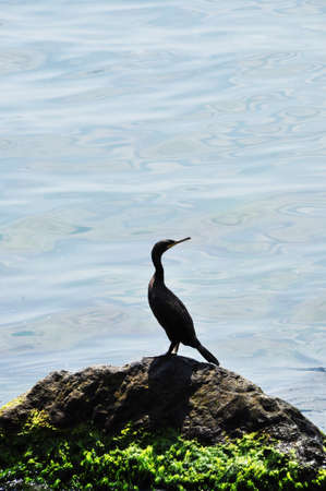landscape portrait, young specimen of great cormorant, resting on rocks on the shore of the blue Mediterranean Sea
