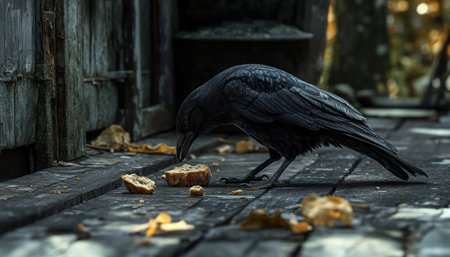 crow eat bread crumbs on the wooden floor of an ancient house