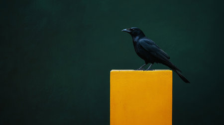 Black crow perched on yellow block against dark green background