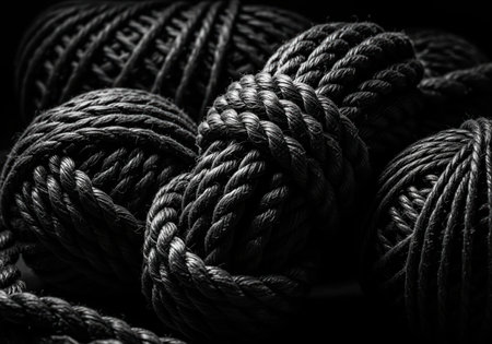 Thick braided rope balls photographed in a dramatic, dark monochrome, low key style. close up view emphasizing the dense, coarse, and rugged texture of the cord. symbolic of strength and binding.