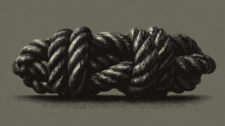 Coiled, intertwined thick rope is presented in a detailed drawing, featuring striking light and shadow effects across its surface.