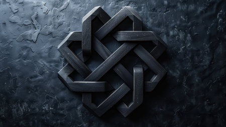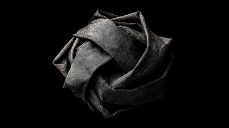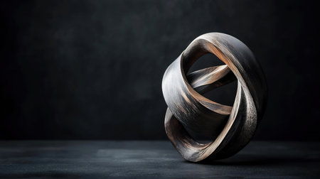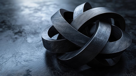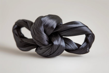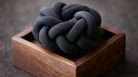 This artistic composition features a black textile knot resting elegantly on a wooden box, creating a stylish contrast with its dark background. Perfect for decorative and design projects.