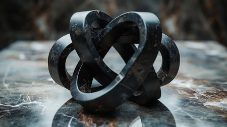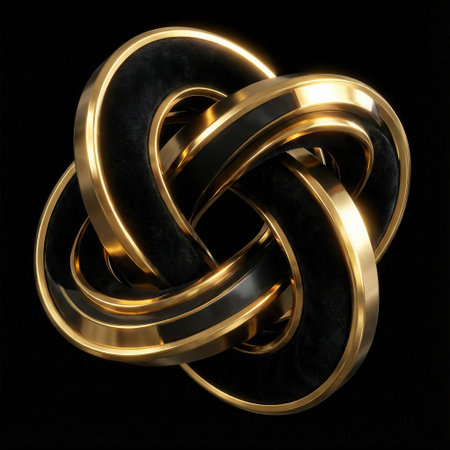 Golden knot sculpture of interlocking metallic loops with black inlay and glossy gold edges. Studio lighting casts deep reflections and bright highlights that define smooth curves against a dark background