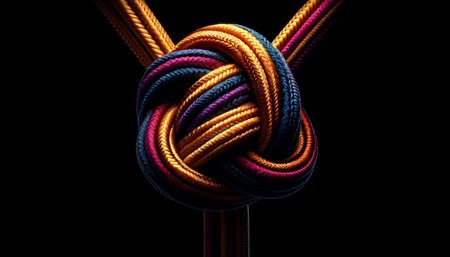 Close-up view of vibrant multi-colored ropes tied in a detailed knot, showing texture and the concept of connection and resilience in a striking manner.