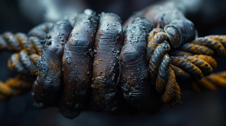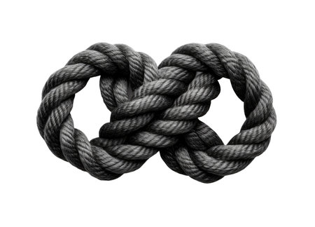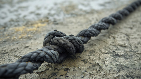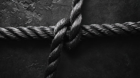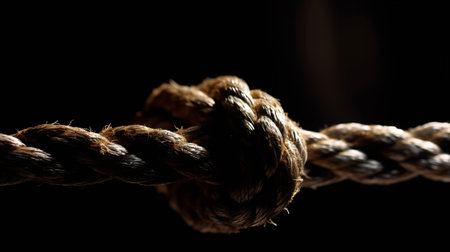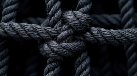 Close-up view of a tightly bound rope knot, highlighting textures and details against a dark background, perfect for representing strength and connection.