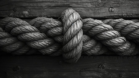 A detailed view of a thick, knotted rope twists and loops, highlighting its texture and craftsmanship. The monochrome color scheme emphasizes the strength and durability of the material, creating a striking visual.