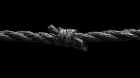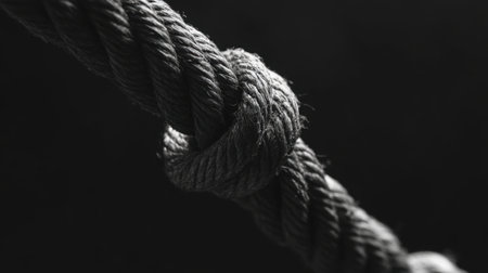 This close-up image captures a knotted rope against a black background, showcasing its texture and strength in a striking black and white format.