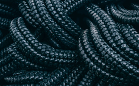 Close-up of tightly coiled black rope, textured surface. Nautical and industrial concept