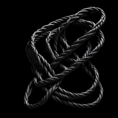 This image features a meticulously tied knot in black rope against a dark background, highlighting the craftsmanship and texture in a minimalist style.
