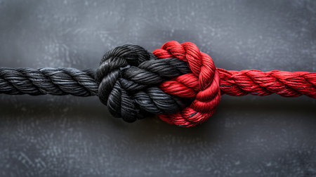 Detailed view of red and black ropes tied together, representing partnership and unity. Perfect for illustrating concepts of cooperation and strong relationships.