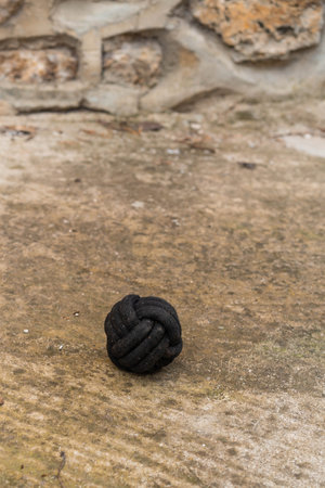 A close-up of a sturdy black rope with an intricate knot lying on a rough, textured concrete surface.