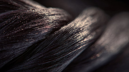 This image captures a close-up view of smooth, shiny dark hair, revealing its natural highlights and glossy texture. Perfect for beauty and wellness themes.