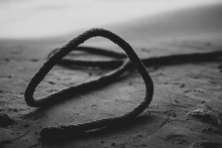 E banner close-up black old fishing tackle twist cotton rope knot on ground. Concept hopelessness, caught by bond, stumped, suicidal mood, environment rubbish. Real life background more tones in stock