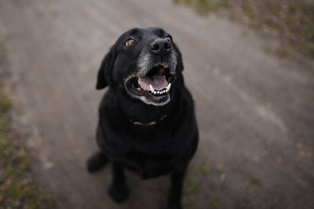 Black dog with mouth open on a dirt road. Shallow depth of field