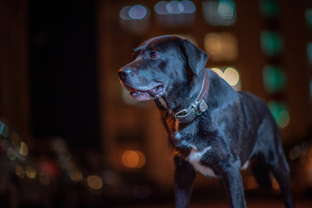Black Labrador Retriever dog in the city at sunset. Selective focus.