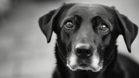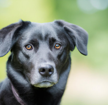 A striking portrait of a black labrador retriever with captivating amber eyes against a softly blurred background. the dog's glossy coat and attentive expression highlight its alert and intelligent nature. Generative AI