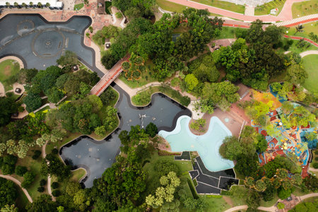 Aerial view of the Central Park in Kuala Lumpur. Malaysia. Kuala Lumpur City Park with pool and Playground.