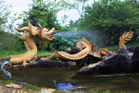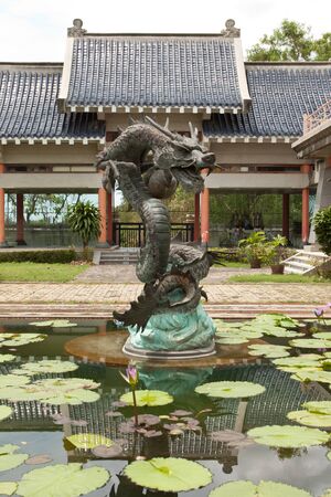 Vintage classic statue of Asian China Dragon sattle in the green garden.