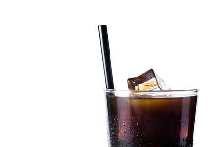 A glass of cola with ice cubes on a white background.