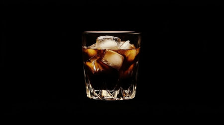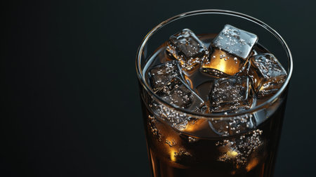 Chilled glass of cola drink with ice cubes isolated on dark background.