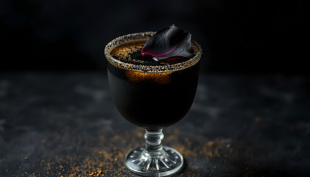 Alcoholic shot cocktail silver bullet with gin, coffee chocolate liqueur and lemon. Black background. Horizontal view. Copy space