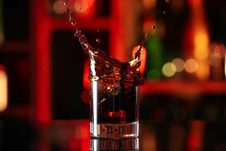 a glass of whiskey with ice on the bar close up.