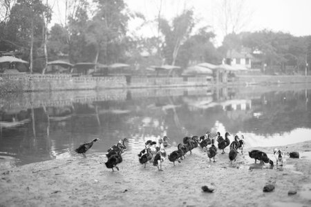 A black and white shot of geese in a farm