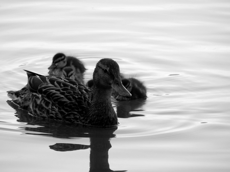 Female duck guiding her ducklings across calm pond in sunlight, forming a natural line of movement, tranquil moment of family in nature concept of childhood