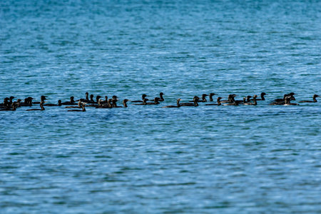 Flock of little black cormorants or Phalacrocorax sulcirostris on Tauranga harbour.
