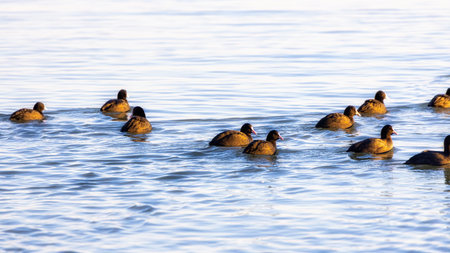 Flock of coots ( fulica atra ) walking on frozen surface of the lake.