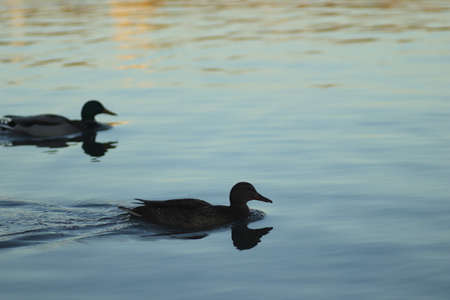 ducks swimming in the lake in the city park in the evening
