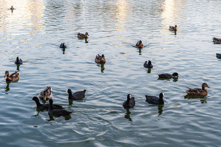 A flock of ducks and gulls swim in the lake in search of food. Waterfowl. wild birds