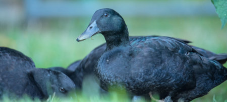group of black cayuga ducks foraging among green grasses
