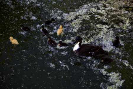 Wild Mallard duck with Youngs - Anas platyrhynchos in the water. Beauty in nature. Spring time. Birds scene. Young ones. Detailed natural scene. Animal theme.