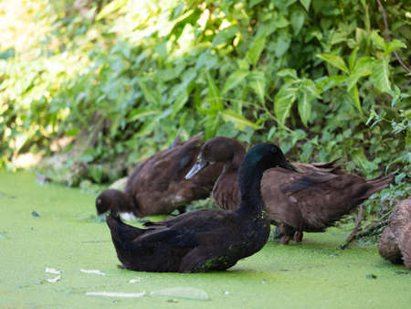 A group of wild brown ducks resting by the pond on a rainy summer day. Wildlife, waterfowl in natural conditions.