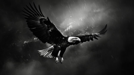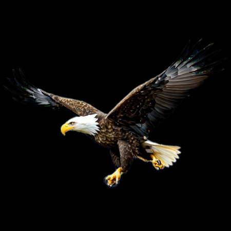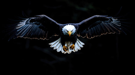 A majestic bald eagle soars gracefully through the air, showcasing its impressive wingspan and striking features against a dark backdrop. This powerful bird symbolizes freedom and strength in nature.