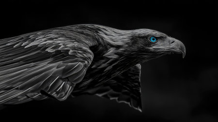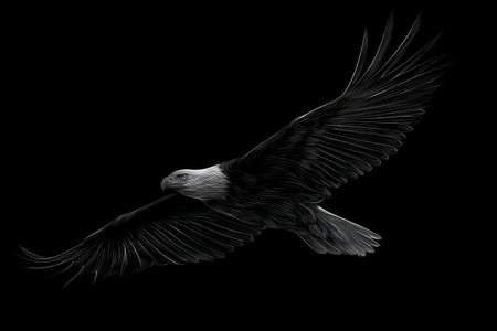 Detailed black and white illustration of an eagle in mid-air, with outstretched wings, showcasing the intricate feather detail. The image features a stark contrast between the dark background and the detailed, light-toned image of the eagle, giving a powerful and elegant feel.