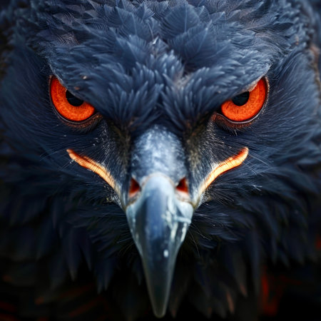 Focusing on the intense gaze of a hawk, this close view captures the vivid orange eyes and razor-sharp beak. The textured feathers add depth, highlighting the bird's powerful presence.