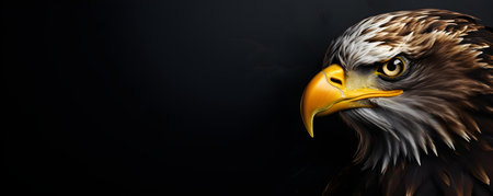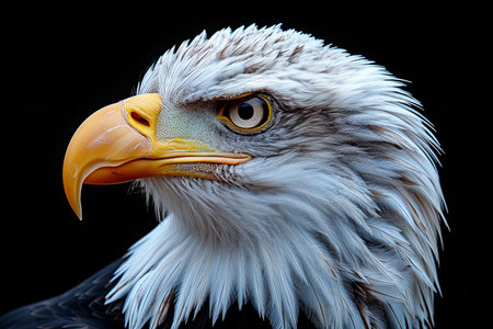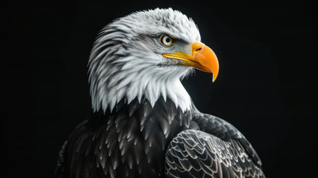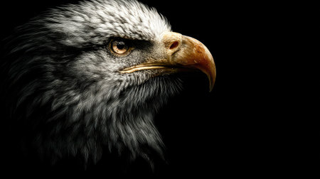 Side view of a Bald Eagle up close (Haliaeetus leucocephalus). Bird of prey head portrait with copy space on a black background. Generative AI