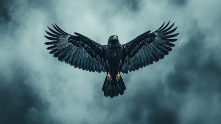 A majestic bird of prey soars through a moody, cloudy sky, showcasing its impressive wingspan and dark plumage.