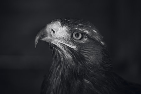 A grayscale shot of an eagle face isolated on dark background