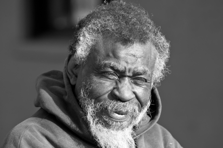 Portrait of old African American homeless man in black in white outdoors