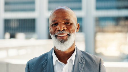 Business, building and portrait of black man in city for career inspiration or opportunity. Architecture, location and real estate with mature property developer outdoor downtown for commercial sale