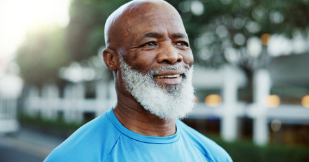 Fitness, thinking and smile with black man outdoor in neighborhood for cardio training or running. Exercise, health and vision with mature African runner on sidewalk for challenge or workout bokeh