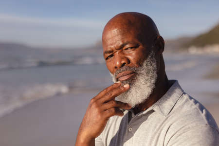 Close up of thoughtful senior african american man standing on the beach. travel vacation retirement lifestyle concept