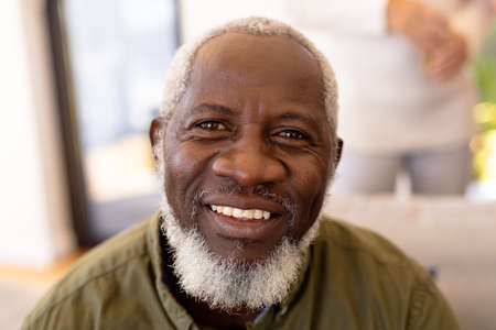 Close-up portrait of smiling bearded african american senior man in nursing home. Happy, face, unaltered, support, assisted living and retirement concept.