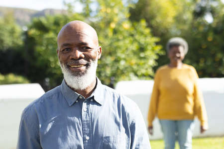 Portrait of smiling african american senior man standing in backyard on weekend. unaltered, lifestyle, leisure and retirement.