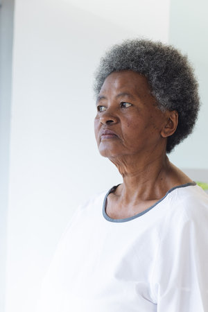 African american senior female patient looking out window in hospital room. Medicine, healthcare and medical services, unaltered.