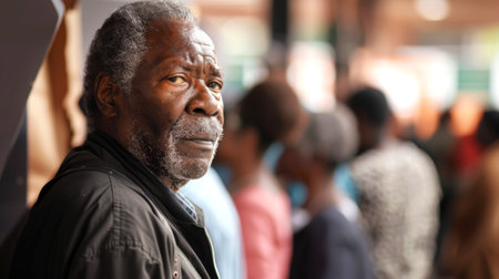 African American elderly man at polling station. Senior black male voter preparing to cast his vote. Concept of elections, civic duty, democratic process, voting rights, diversity. Copy space